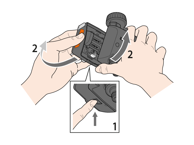 Per inserire o sostituire le batterie, premere a fondo il tasto inferiore e contemporaneamente sganciare la parte anteriore del programmatore.