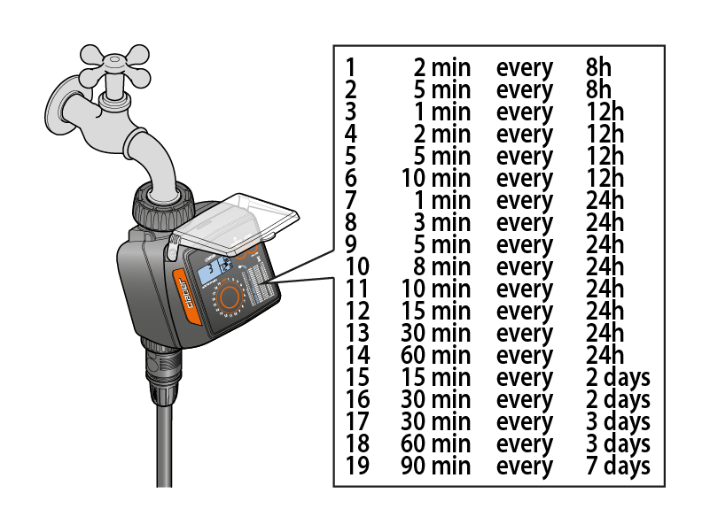 Premere una o più volte il tasto “P” fino a visualizzare sul display “C” il programma che soddisfa le propire esigenze (ad es. 3 = 1 minuto ogni 12 ore): sul display “D” viene visualizzata la durata (quanti minuti irrigare); sul display “E” viene visualizzata la frequenza (ogni quanto tempo irrigare).