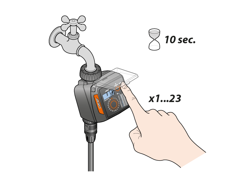 Rilasciato il tasto, dopo 3 lampeggi del numero di ore impostate, inizia il conto alla rovescia per la partenza dell’irrigazione automatica, visualizzato sul display “C” sopra il simbolo “clessidra”.