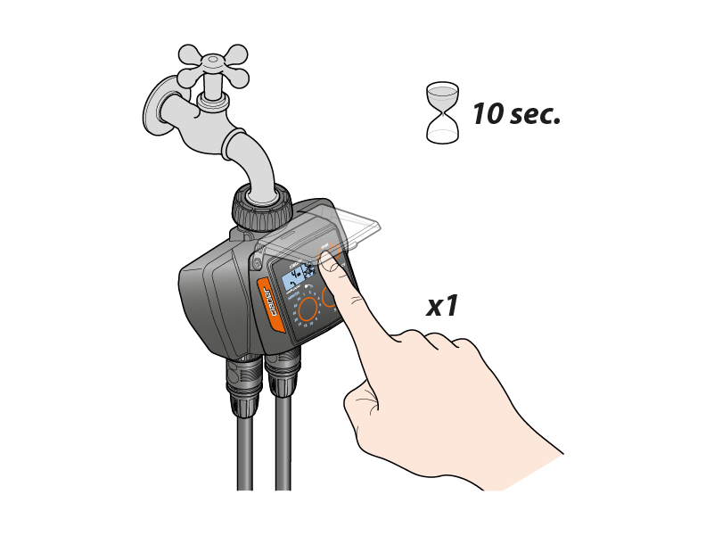 Rilasciato il tasto, dopo 3 lampeggi del numero di ore impostate, inizia il conto alla rovescia per la partenza dell’irrigazione automatica, visualizzato sul display “C” sopra il simbolo “clessidra”.