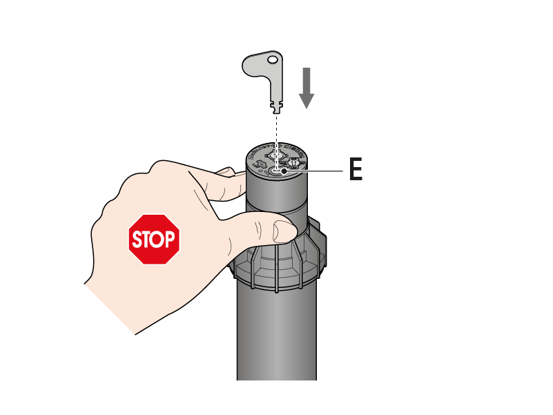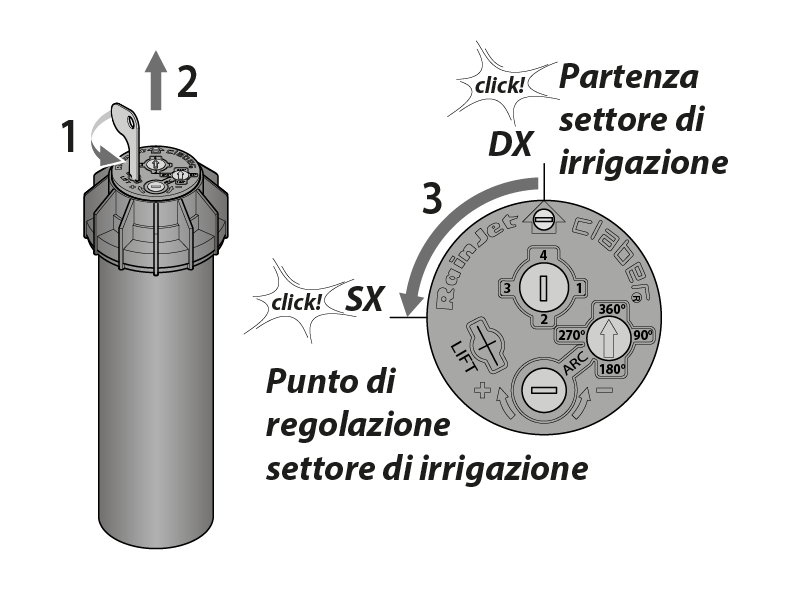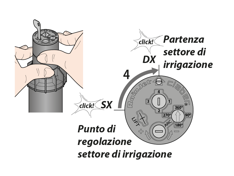 Per diminuire il settore di irrigazione: tenere bloccata la torretta e girare in senso antiorario la chiavetta.