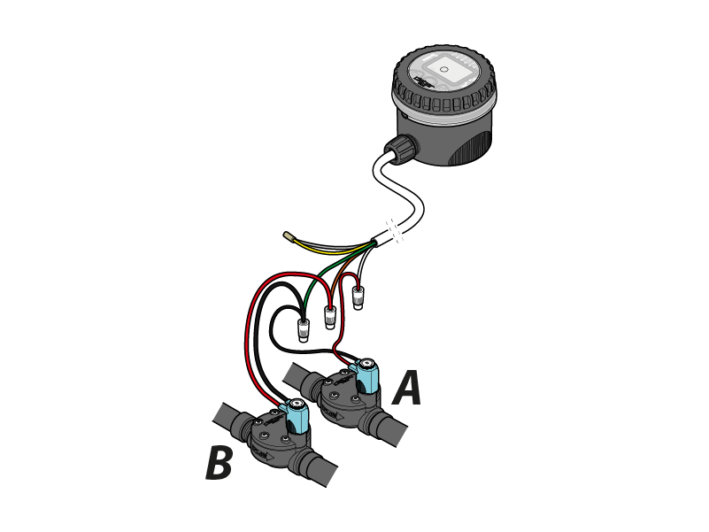 Il modulo di comando può pilotare fino a due elettrovalvole con solenoide bistabile a 9V. Collegare il filo verde al polo negativo (filo nero) di ciascuna elettrovalvola (comune). Collegare il filo bianco al polo positivo (filo rosso) dell’elettrovalvola A. Collegare il filo marrone al polo positivo (filo rosso) dell’elettrovalvola B.