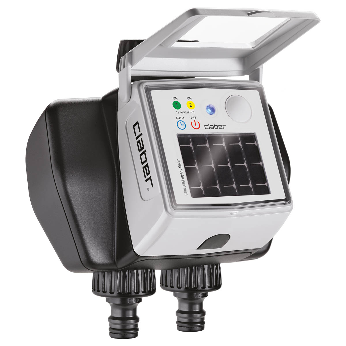 Programmatore automatico a due vie, con irrigazione su linee indipendenti. Dotato di un pannello fotovoltaico integrato, funziona con energia solare anche senza essere esposto direttamente ai raggi del sole. Non necessita dell'utilizzo di batterie. Facile programmazione attraverso tecnologia Bluetooth® e app Claber myAquaSolar. 2 programmi totalmente personalizzabili per linea. Tasto per messa in off del programmatore e avvio della funzione manuale (attivabile anche da App). Programmazione settimanale con esclusione dei singoli giorni. Parti elettroniche isolate e assenza di cavi a vista. Attacco rubinetto 3/4” (20-27 mm) con ghiera pivotante. Filtro lavabile. Pressione di esercizio da 0,5 a 10 bar. Collegabile al Rain Sensor base (90915). Controllato e testato al 100%.