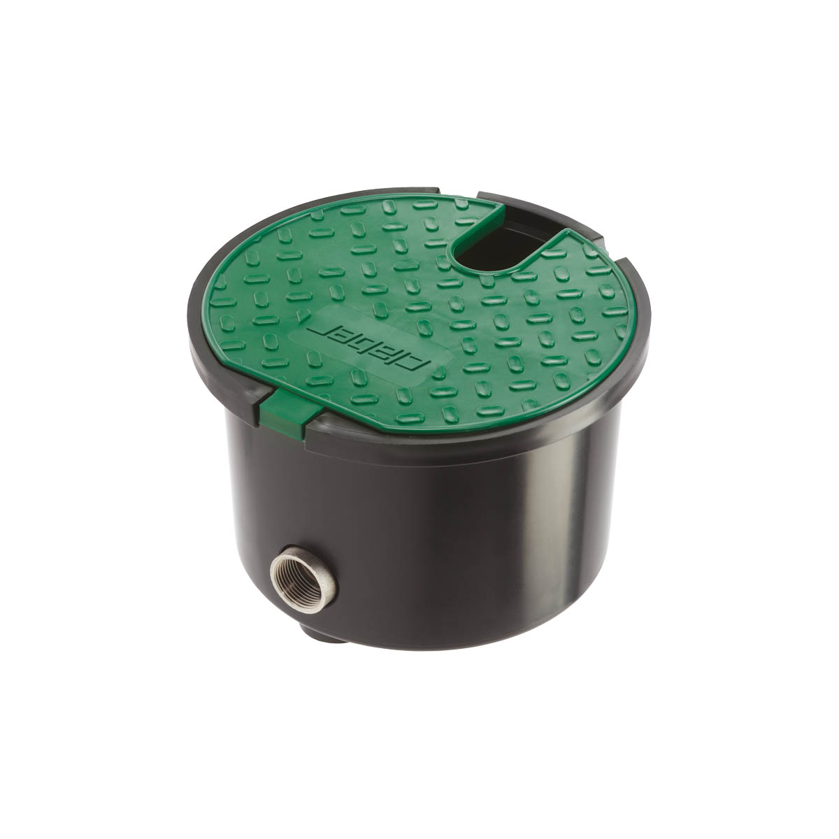 Pozzetto di forma circolare con coperchio a cerniera, sagomato per il passaggio del tubo. Si collega all'impianto interrato da una delle due uscite filettate 3/4" F poste sotto e di lato. Tappo con OR in dotazione per bloccare l'uscita non utilizzata. Al suo interno è presente un rubinetto metallico filettato 3/4" M con valvola a sfera, per la facile connessione di un tubo flessibile. Fori sulla base per permettere lo scolo dell'acqua.