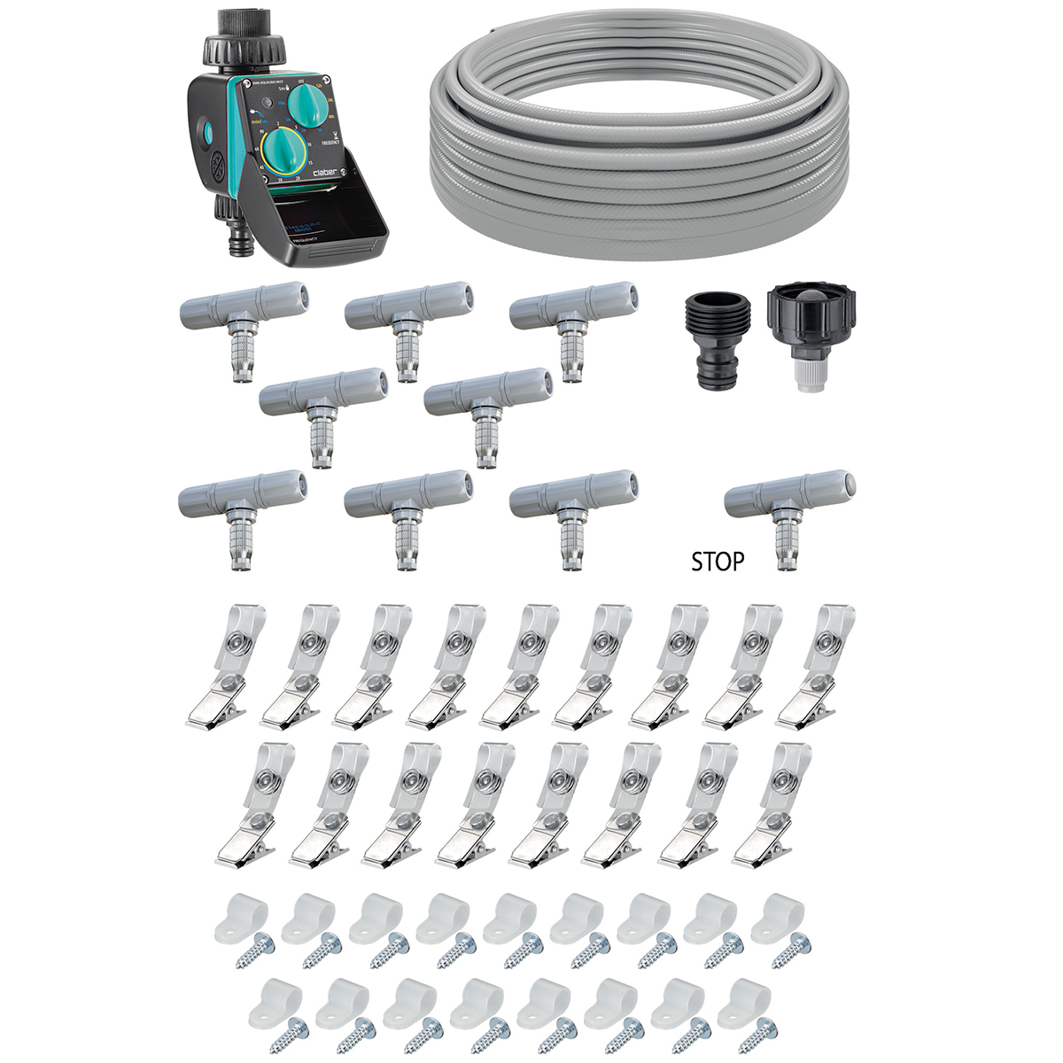 Kit di nebulizzazione per rinfrescare gli spazi all’aperto durante le calde giornate estive. Il kit (composto da 12 m di tubo, 9 micronebulizzatori, raccordi e clip di fissaggio) può essere facilmente agganciato a tende parasole, gazebi e ombrelloni. I micronebulizzatori, con ugelli in ottone anti-goccia, vaporizzano nell’aria microscopiche gocce d’acqua che permettono di raffreddare l’ambiente fino a 6°C in meno. Il kit include anche il programmatore a batteria Aquauno Mist, che attiva in maniera automatica e ad intervalli regolari il sistema di raffrescamento. Pressione di esercizio 3-6 bar.