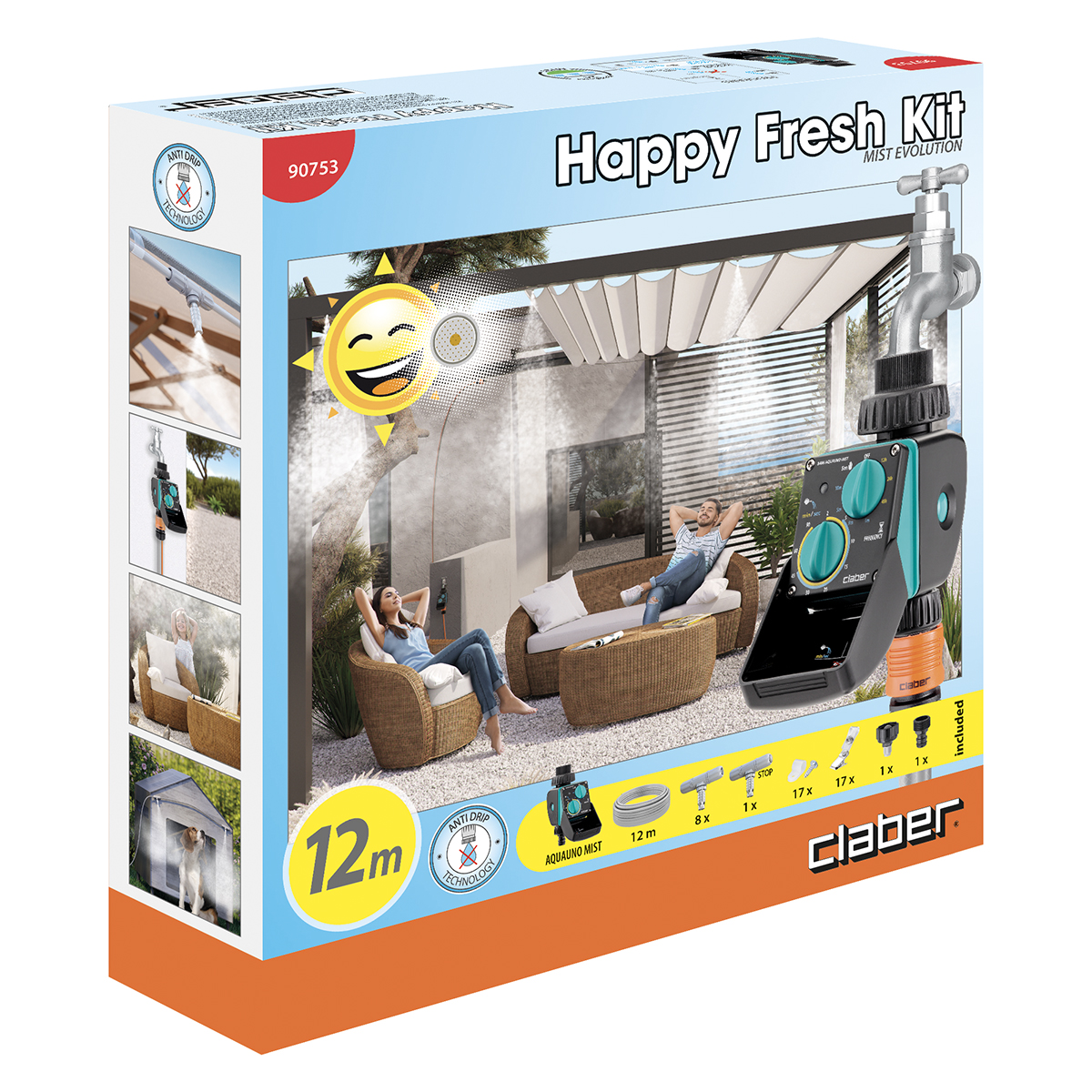 Happy Fresh è il pratico kit ideato da Claber per rinfrescare le calde giornate estive. Rapido da montare, Happy Fresh Kit si aggancia con semplicità a ombrelloni, gazebi e tende parasole; basta un rubinetto su cui installare Aquauno Mist e impostare la frequenza e la durata delle nebulizzazioni.