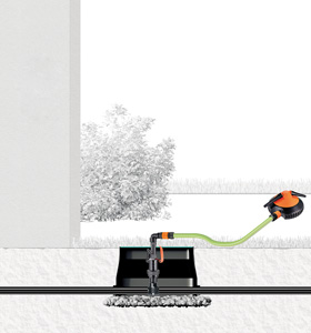 Completo di asta con innesto a baionetta dotata di presa maschio Quick-Click per collegare tubi flessibili in ogni angolo del giardino. Valvola per l’apertura e la chiusura automatica. Attacco con filetto maschio 3/4” (20-27 mm) per il collegamento alla presa a staffa.