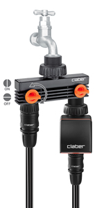 Con doppia regolazione indipendente. Per rubinetti con filetto 3/4” (20-27 mm). Consente il montaggio di due programmatori elettronici, riduttori di pressione, etc.